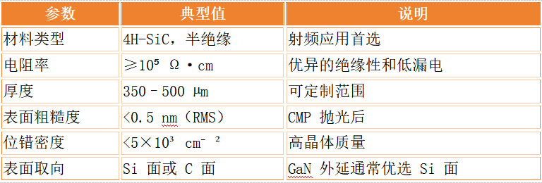 来自 Wolfspeed、Coherent(II-VI)、ROHM 等主流厂商的商用 SI-SiC 晶圆,通常为 4H-SiC,厚度约 500 µm。