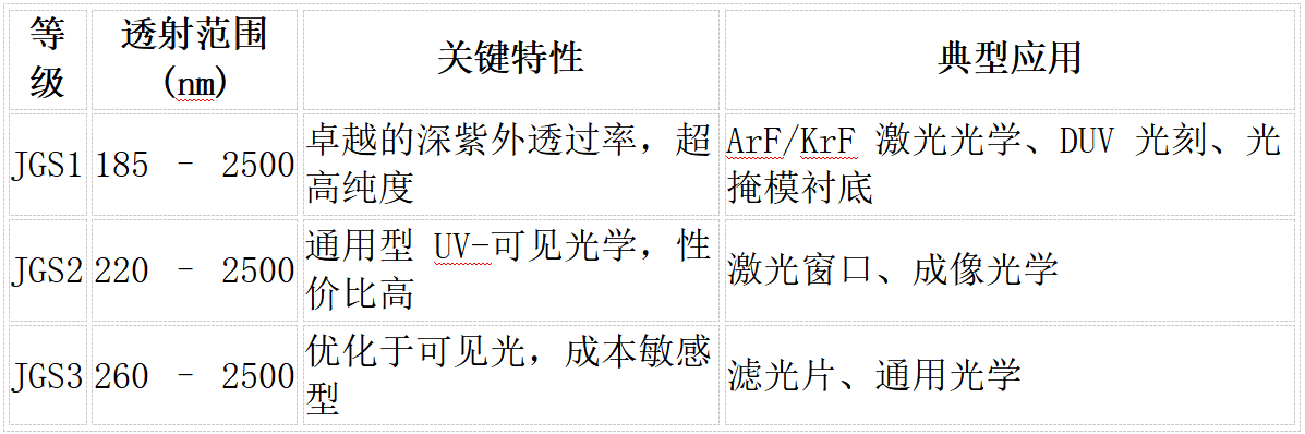 在 JGS 系列中,JGS1 是唯一能在深紫外(<200 nm)波段保持高透过的等级。以下表格对比了 JGS1、JGS2 和 JGS3:
