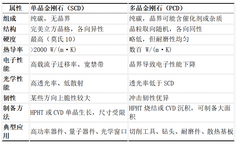 尽管单晶与多晶金刚石都具有sp³键合的碳结构,但它们在结构、性能、成本及应用上存在显著差异。单晶金刚石代表了性能极限与技术前沿,而多晶金刚石则以成本优势与工程实用性见长。