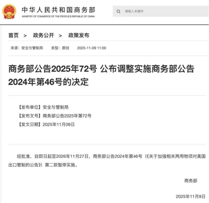 2025年11月9日,中华人民共和国商务部发布公告,决定自即日起至2026年11月27日,暂停执行《商务部公告2024年第46号》第二款内容。