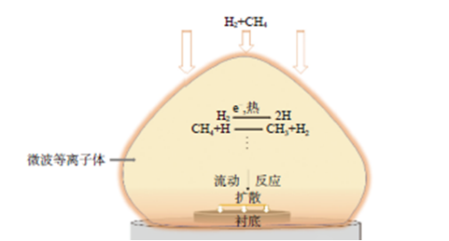 在 MPCVD 设备中,微波能量在低压环境下激发气体形成高密度等离子体。氢气(H₂)与甲烷(CH₄)被激发并离解为高活性物种,在衬底表面发生吸附、扩散和成键,从而实现金刚石的有序沉积与外延生长。