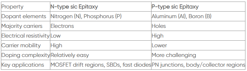在整个 SiC 器件制造链中,外延层(Epitaxy)是衔接衬底与最终器件的关键环节。它不仅决定了器件的电学特性,还直接影响其效率、稳定性与可靠性。根据主要载流子的不同,SiC 外延层通常分为两大类:N 型外延层和P 型外延层。二者各自承担着不同功能,在器件设计中往往需要协同配合。